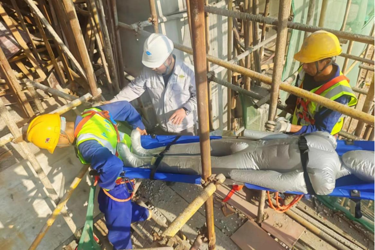 演練過程中,參演人員劃分為收集組、保障組、警戒組、聯(lián)絡(luò)組、搶救組,通過模擬突發(fā)“高處墜落”事故,項(xiàng)目部迅速啟動(dòng)應(yīng)急救援預(yù)案,快速、高效、有序?qū)嵤┚仍ぷ鳎畲蟪潭冉档褪鹿蕮p失,有效減少人員傷亡和財(cái)產(chǎn)損失,維護(hù)施工人員生命安全。