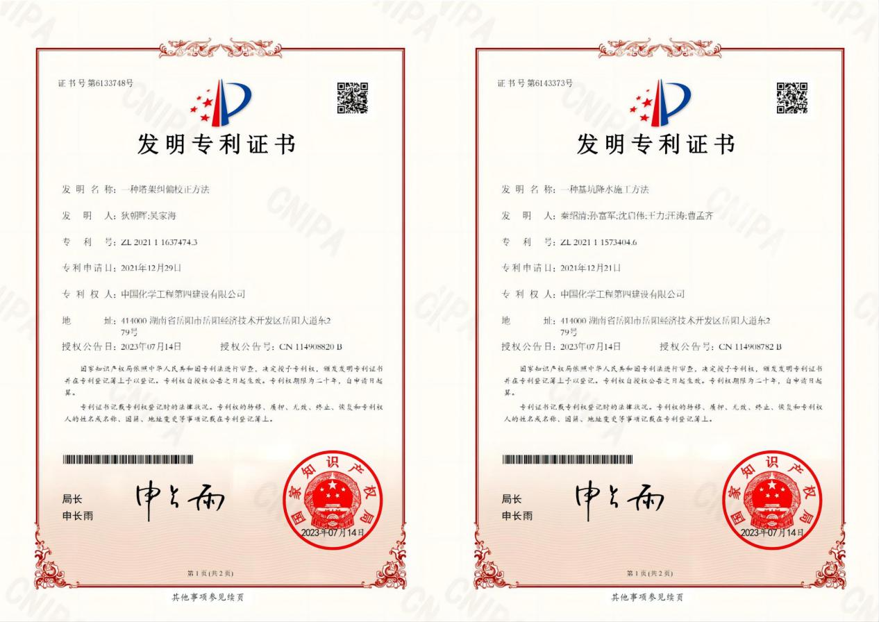 近日,從國家知識產權局傳來喜訊,公司新獲兩項發明專利。其中專利“一種塔架糾偏校正方法”,發明人為華東公司狄朝暉、吳家海,專利號ZL202111637474.3;專利“一種基坑降水施工方法”,發明人為華東公司秦紹清、孫富軍、沈啟偉、王力、汪濤、曹孟齊,專利號ZL202111573404.6。