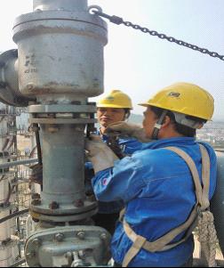 塔頂管道復(fù)位完成后,管道即可進(jìn)入全面試壓階段。從而保證整個項(xiàng)目的中交的如期進(jìn)行。 (圖為施工人員正在C-201塔頂安裝安全閥)