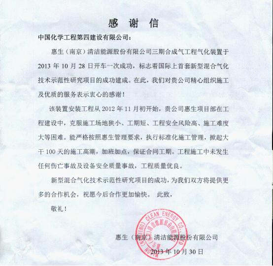 三期合成氣項目氣化裝置一次開車成功,具有重大意義。它標志著我公司在新型混合氣化裝置安裝工程領域開辟了一片新天地,為公司業績譜寫了新的篇章。