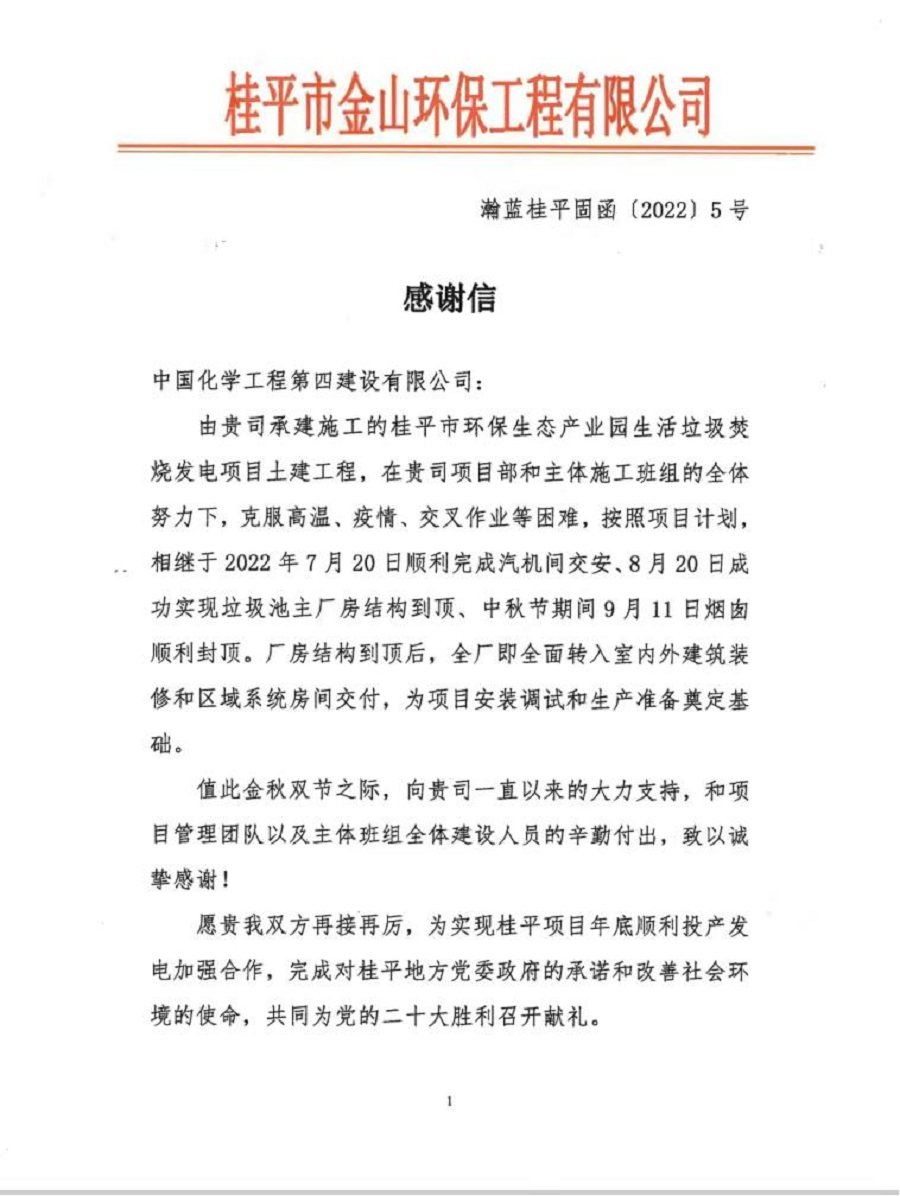 近日,由華南公司承建的桂平垃圾焚燒發(fā)電項(xiàng)目收到業(yè)主桂平市金山環(huán)保工程有限公司的感謝信,感謝公司的大力支持和項(xiàng)目團(tuán)隊(duì)、主體班組全體建設(shè)人員的辛勤付出。