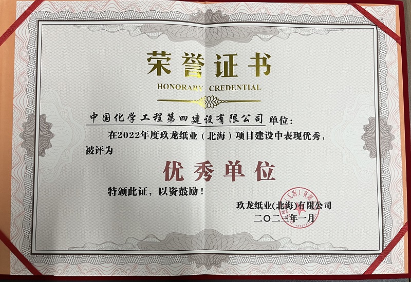 近日,西部公司北海玖龍紙業(yè)項目管理團隊因在項目建設中表現(xiàn)優(yōu)秀,獲得玖龍紙業(yè)(北海)有限公司頒發(fā)的“優(yōu)秀單位”榮譽稱號。