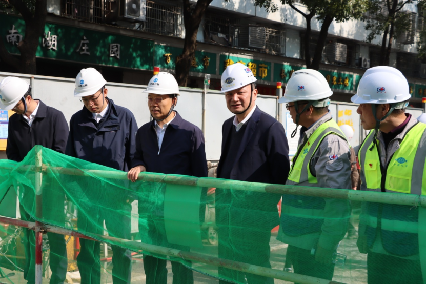 王殿常一行先后來到了項目部西瓜山濕地公園和求索西路雨污分流改造工程調研。彼時的西瓜山濕地公園湖水碧波蕩漾,岸坡綠草青青,改造后的西瓜山項目污澇同治、成效顯著,大家實地見證了從黑臭水體到“城市綠肺”的華麗轉身,開園后將成為九華山片區周邊居民打卡休閑的好去處。另一處的求索西路雨污分流改造工程采用頂管施工技術,作業人員正在進行倒掛壁和頂管施工,通過新建污水管網打通“主動脈”。該處為南津港片區污水主干管,收集南津港周邊污水,提高COD濃度,減輕南津港污水處理廠壓力,達到提質增效的目的。