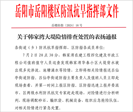 7月5日,岳陽市委常委、常務(wù)副市長李建華到項目現(xiàn)場督導(dǎo)防汛工作,對公司前段防汛工作給予充分肯定。同日,岳陽市岳陽樓區(qū)防汛抗旱指揮部發(fā)來通報,對項目部精心組織、及時處置,確保管涌險情得到有效控制予以表揚,并對喻希陽予以嘉獎。