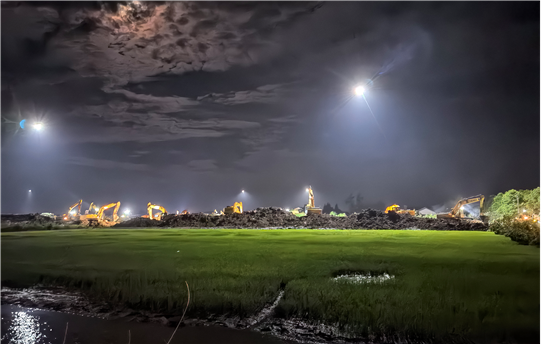 因第三道防線地處岳陽市君山區(qū)良心堡鎮(zhèn)一個(gè)小村落,基礎(chǔ)設(shè)施極不完善,施工面臨村內(nèi)稻田、水塘、溝渠縱橫,高壓線、照明線架設(shè)高度不夠,搶建期間社會(huì)車輛、搶險(xiǎn)車輛密集通行,土方石方須遠(yuǎn)距離運(yùn)輸?shù)痊F(xiàn)實(shí)困難,公司不等不靠,多方協(xié)調(diào)、創(chuàng)新方法,有效克服了大型機(jī)械進(jìn)場難、場內(nèi)交通組織難、土方石方調(diào)配難、安全管理執(zhí)行難等難以想象的困難,比預(yù)期提前8個(gè)小時(shí)實(shí)現(xiàn)堤壩合龍。