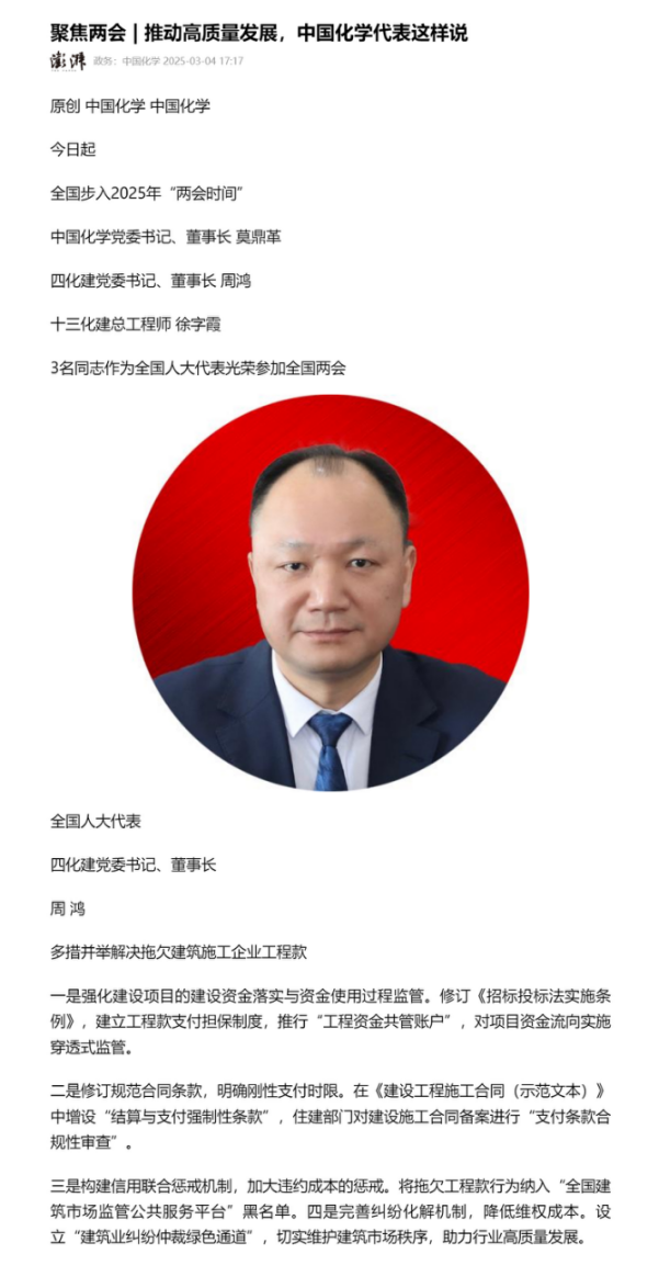 2025年全國兩會期間,全國人大代表,中國化學四化建黨委書記、董事長周鴻向大會提交《關于加強產(chǎn)業(yè)工人隊伍建設的建議》《關于多措并舉解決拖欠建筑施工企業(yè)工程款的建議》《關于推動洞庭湖區(qū)常岳九鐵路、荊岳鐵路、監(jiān)利至華容至益陽鐵路規(guī)劃建設提速的建議》《關于修改最高法院〈關于大型企業(yè)與中小企業(yè)約定以第三方支付款項為付款前提條款效力問題的批復〉的建議》等4條建議,受到主流媒體深入報道,引起社會各界廣泛關注。