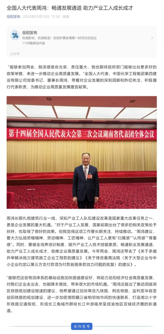 3月10日,岳陽日報·岳陽發(fā)布微信公眾號以“全國人大代表周鴻:暢通發(fā)展通道 助力產(chǎn)業(yè)工人成長成才”為題報道周鴻參加2025年全國兩會。