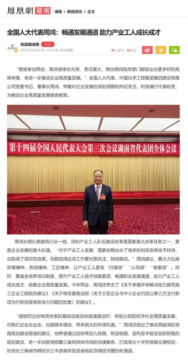 3月10日,鳳凰網(wǎng)湖南頻道以“全國人大代表周鴻:暢通發(fā)展通道 助力產(chǎn)業(yè)工人成長成才”為題報道周鴻參加2025年全國兩會。