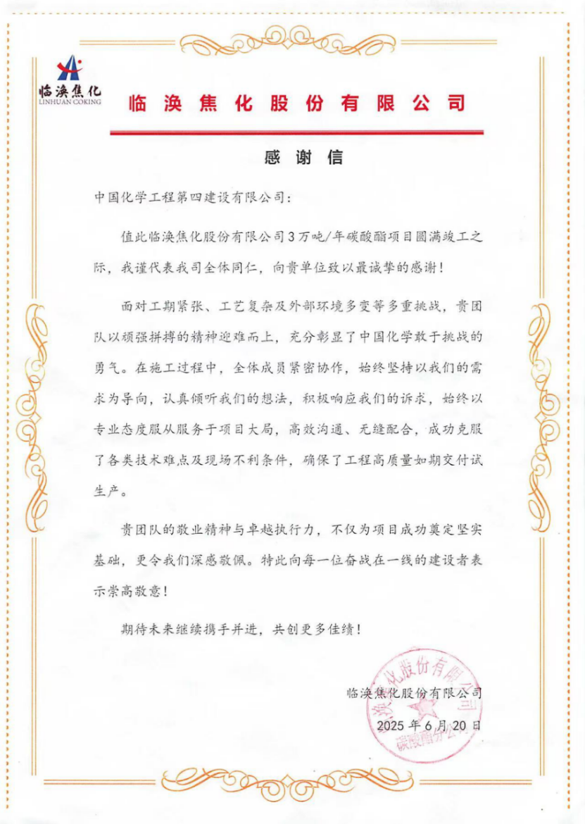 西部公司臨渙焦化碳酸酯項目部收到業(yè)主感謝信