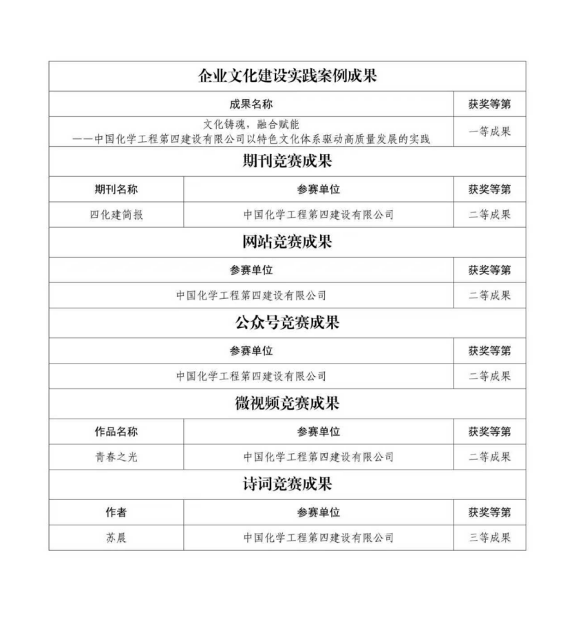 近日,中國施工企業(yè)管理協(xié)會(huì)公布2025年工程建設(shè)企業(yè)文化建設(shè)系列活動(dòng)競賽結(jié)果,中國化學(xué)工程第四建設(shè)有限公司憑借深厚的文化積淀與創(chuàng)新實(shí)踐,一舉斬獲企業(yè)文化建設(shè)實(shí)踐案例一等成果,期刊競賽、微視頻競賽、網(wǎng)站競賽、公眾號(hào)競賽二等成果,詩詞競賽三等成果,彰顯了公司企業(yè)文化建設(shè)的深厚底蘊(yùn)與創(chuàng)新活力。