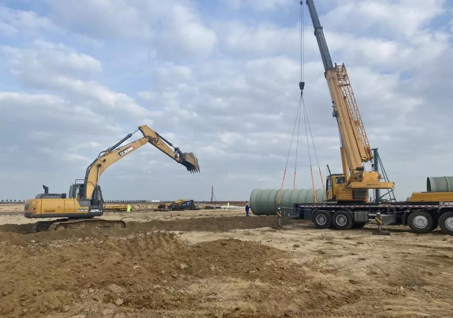此次開工的公用工程項(xiàng)目主要包括13、14標(biāo)段的給排水及消防管網(wǎng)工程。由于工程地管口徑大,其中海水管、雨水管、循環(huán)水管最大直徑分別為DN3200、DN4200、DN2600,多條管線并排放置,基坑開挖深度超過9米,總長(zhǎng)度超過26千米,工程量大,標(biāo)準(zhǔn)要求高。同時(shí),又因施工區(qū)域?yàn)樘詈T礻懀邓潘ぷ魅蝿?wù)重,施工難度增加。