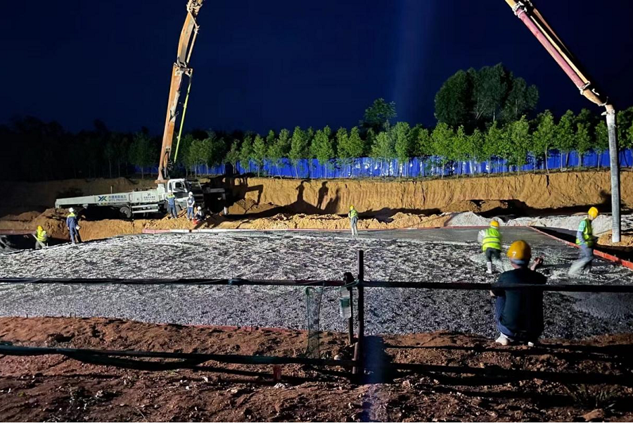 該項目位于崇左市中泰產(chǎn)業(yè)園東北部,過往車輛繁多,土地中遍布頑石,施工空間壓力與工期壓力并存。在工期的緊迫形勢下,項目部調(diào)整施工計劃,增加現(xiàn)場施工人員和設(shè)備物資投入,并合理組織施工資源。白天,70余名工人揮汗如雨;夜間,混凝土澆筑連續(xù)不斷,在嚴(yán)格遵守項目部保安全、抓質(zhì)量的施工標(biāo)準(zhǔn)下,全體員工不辭辛苦、主動作為,快速而穩(wěn)健的推進(jìn)項目工程建設(shè)。